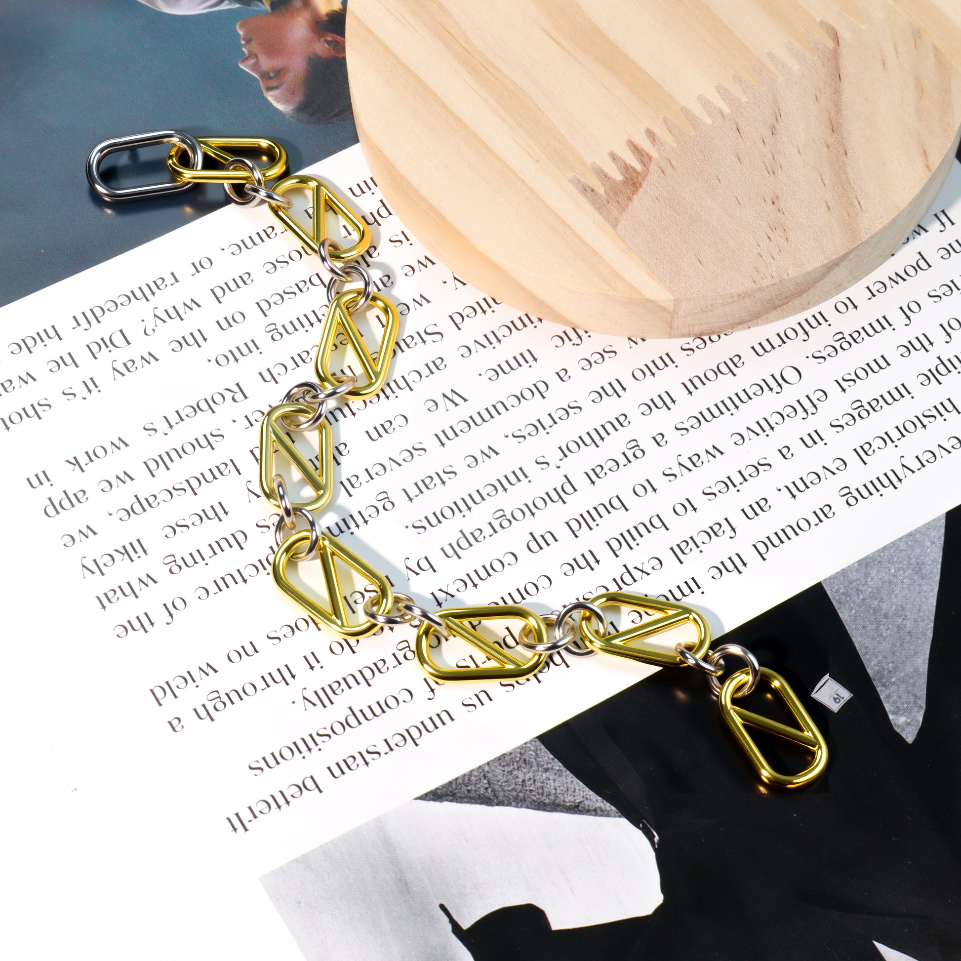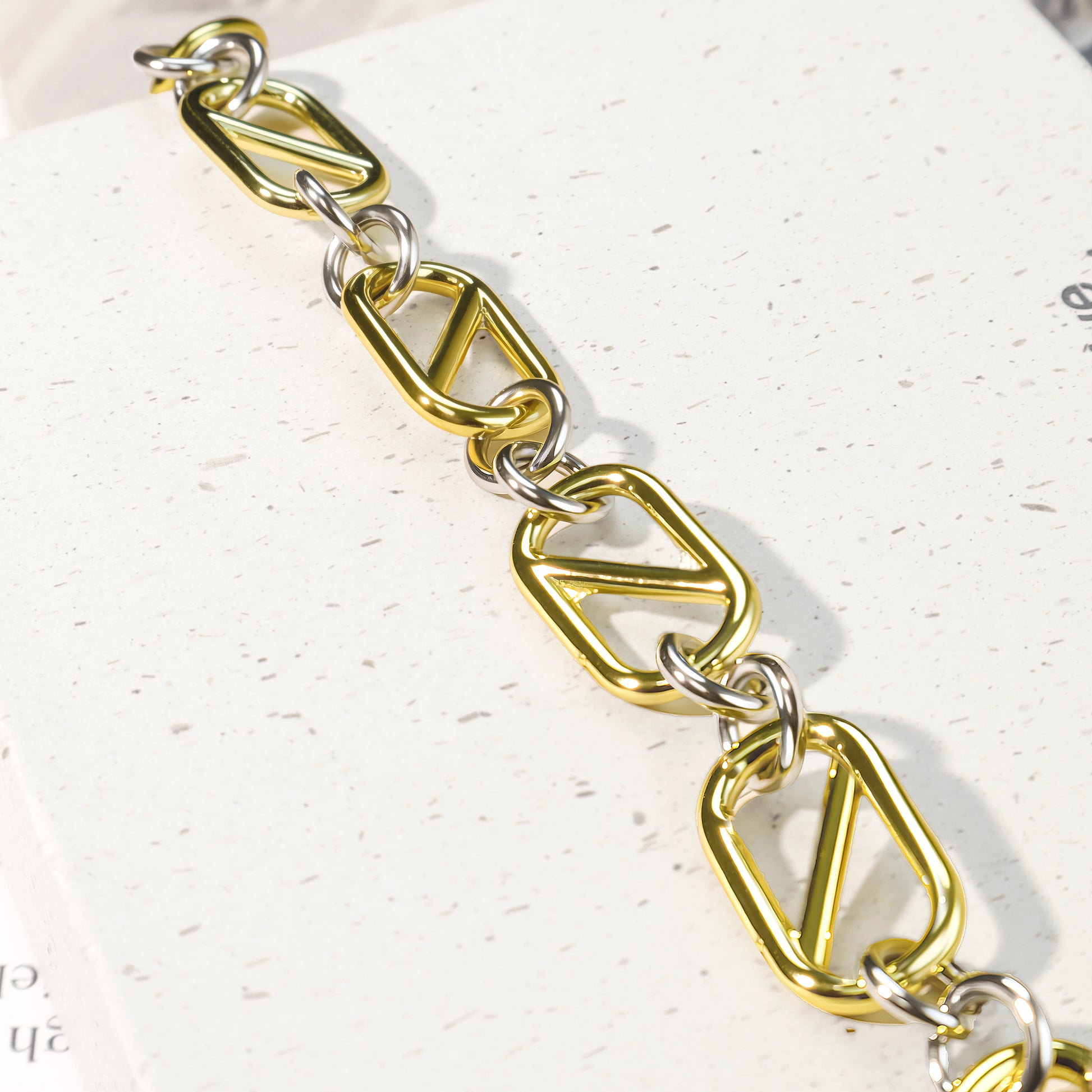 Geometric Aesthetics: Featuring a unique triangular link design paired with a striking two-tone color scheme blending gold and silver hues, the geometric shapes add a modern and avant-garde touch to the overall design, making it a standout piece.