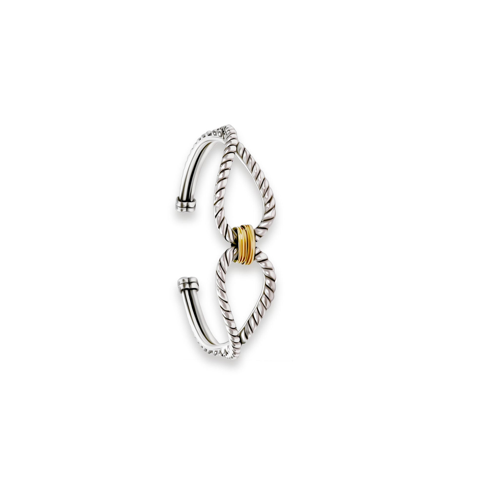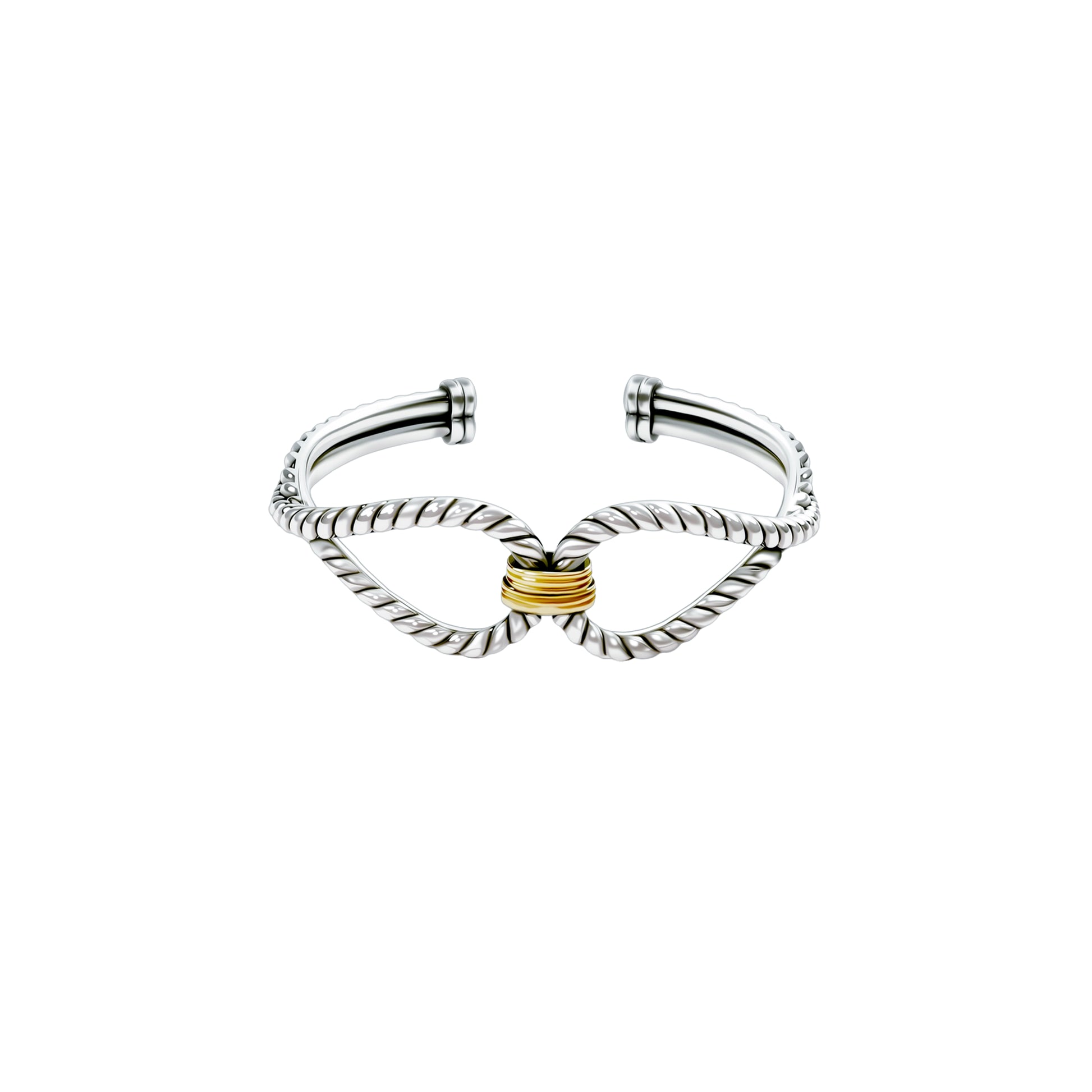 Creative design: The bangle features a silver twisted pattern, creating a symmetrical wing-like shape with smooth and dynamic lines. The center is inlaid with a golden twisted decoration, creating a contrast between the coolness of silver and the warmth of gold, which not only gives it a vintage feel but also adds a delicate highlight, like two intertwined elements that are unique and eye-catching.