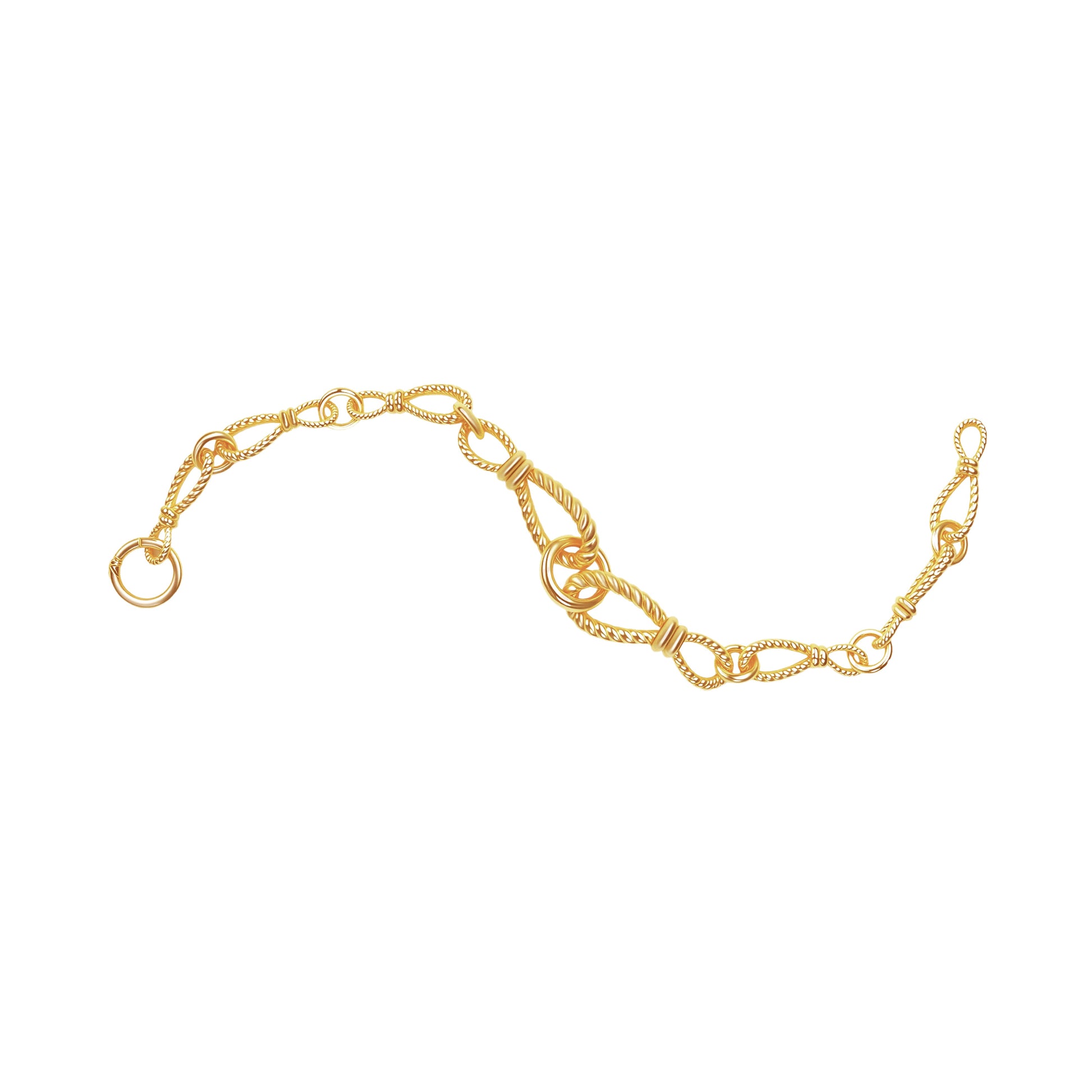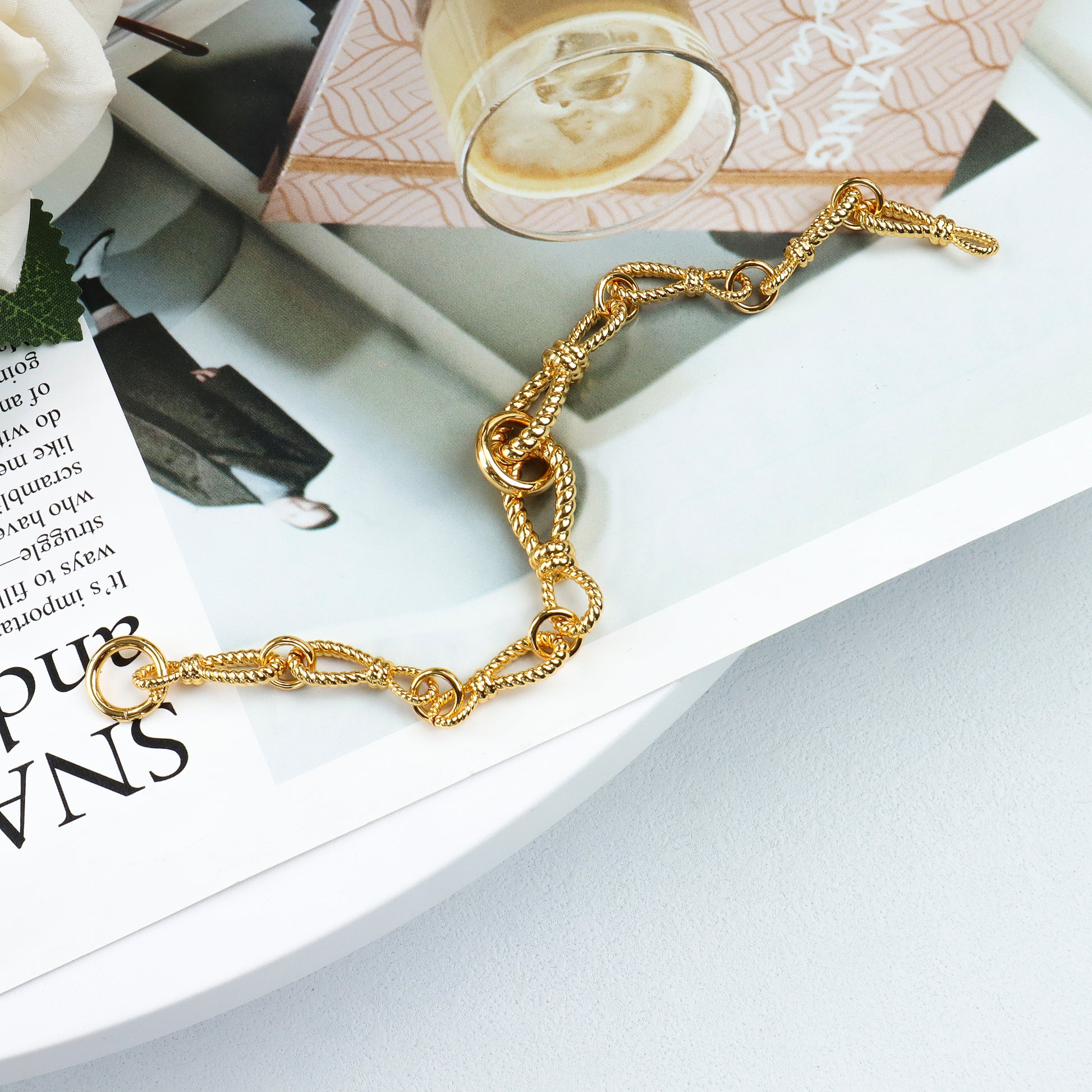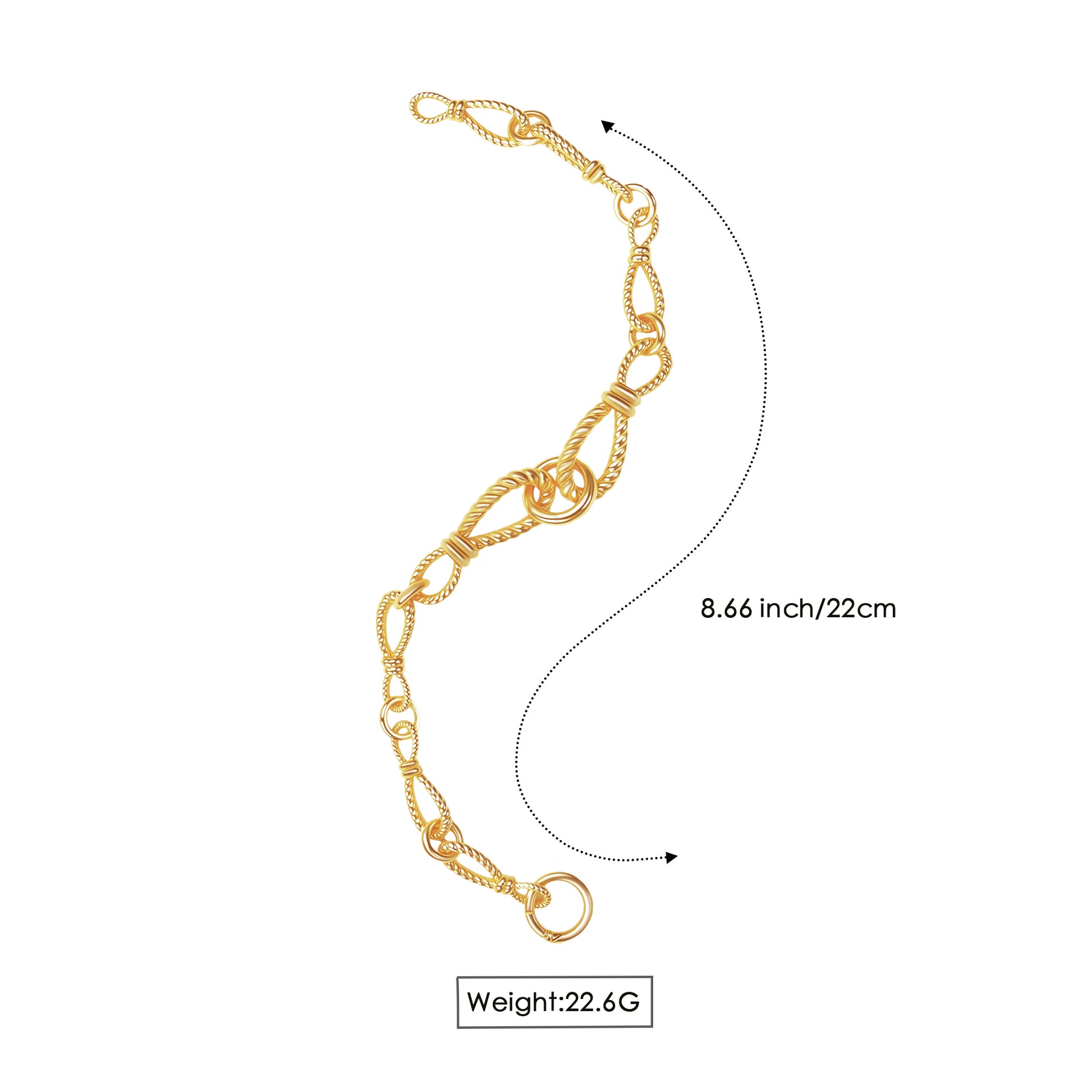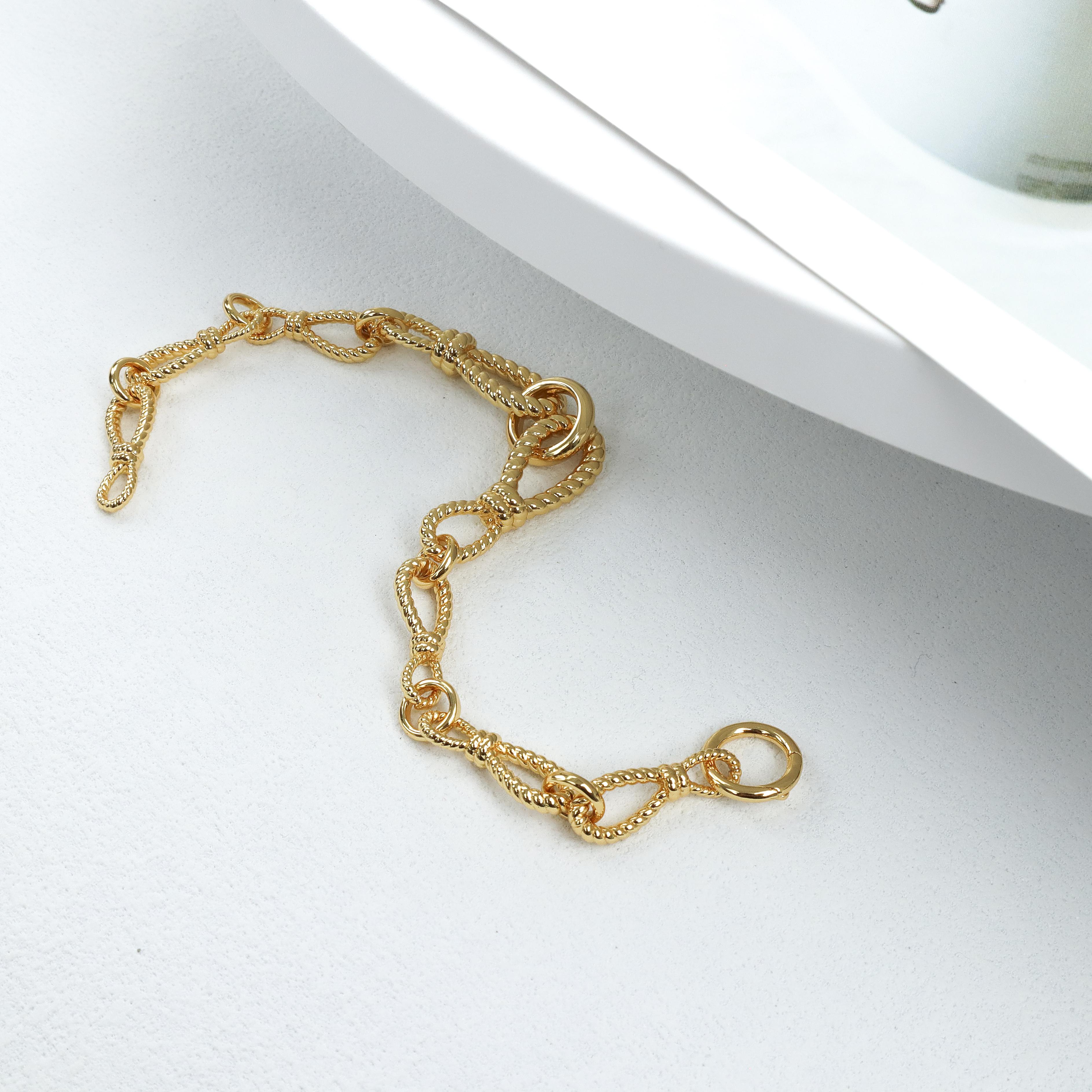Chain design: The bracelet features a combination of multiple textured chains, including twisted chains and ring chains, creating a rich layered look with a vintage feel. The golden tones sparkle in the light, exuding luxury.