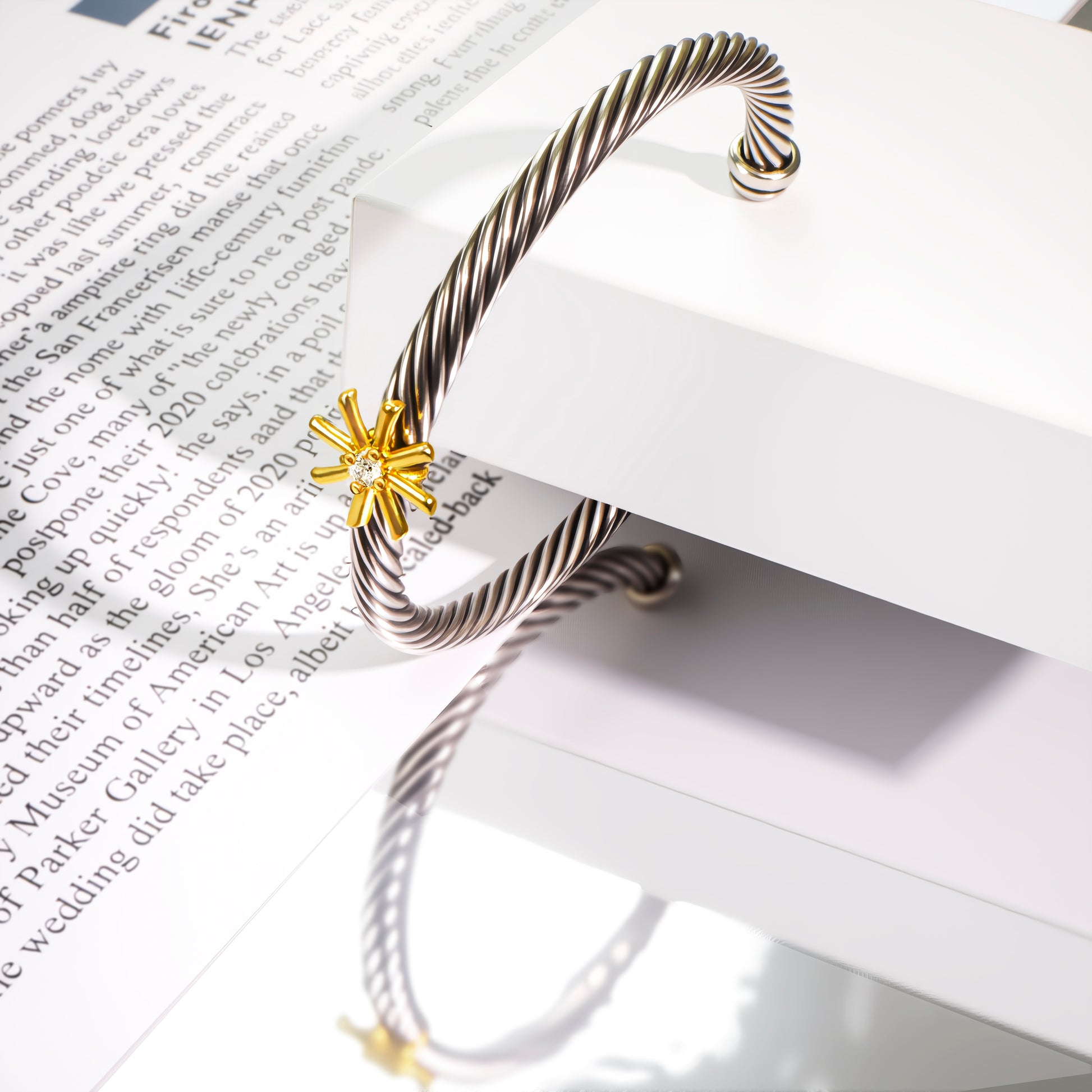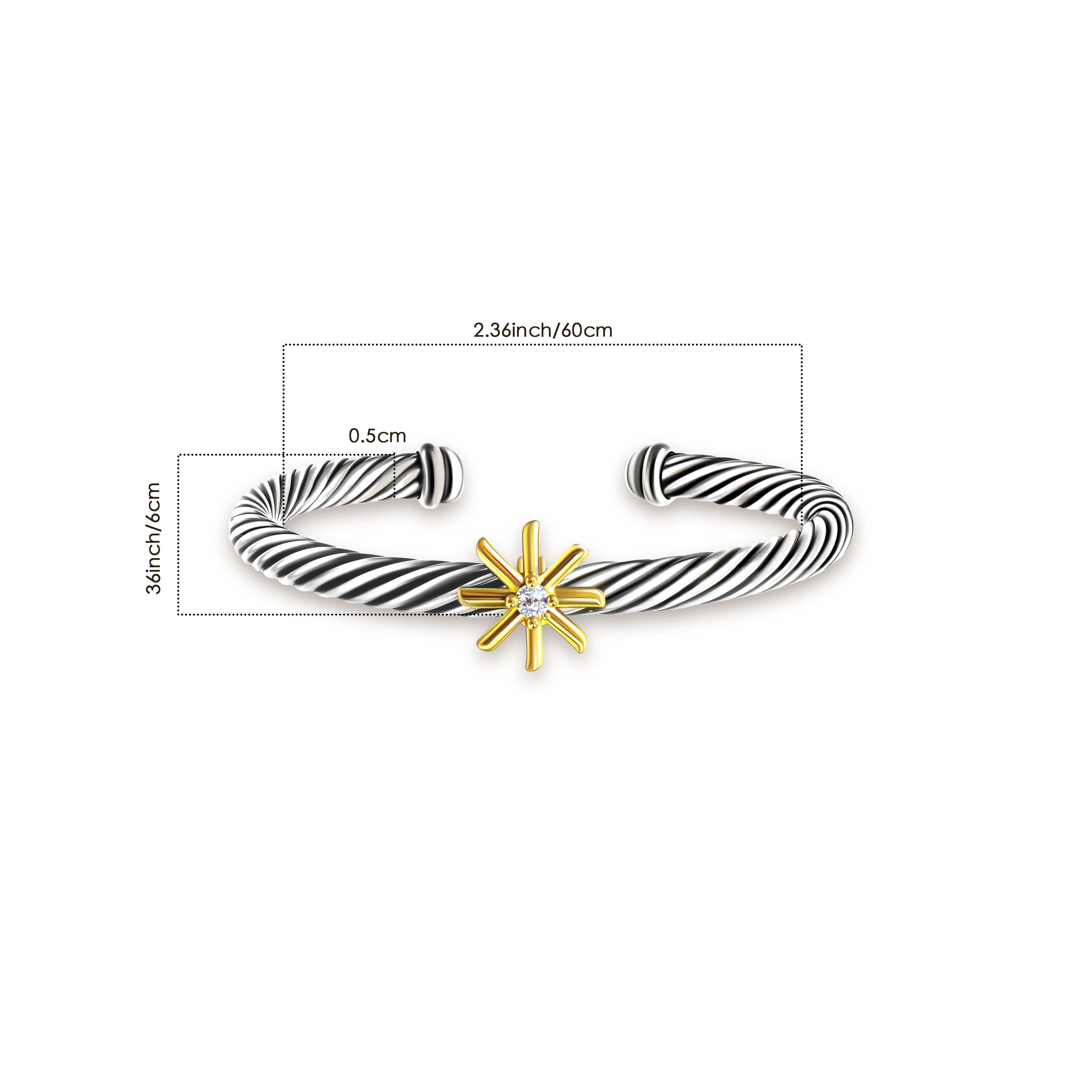 Design Ingenuity: The bracelet features a twisted silver band as its base, with flowing lines and a vintage texture. At the center, a golden starburst-shaped decoration is embedded, with a sparkling small diamond adorning the center of the starburst, resembling the focus of starlight. The coolness of silver, the warmth of gold, and the dynamism of the starburst collide to create a unique visual focal point.