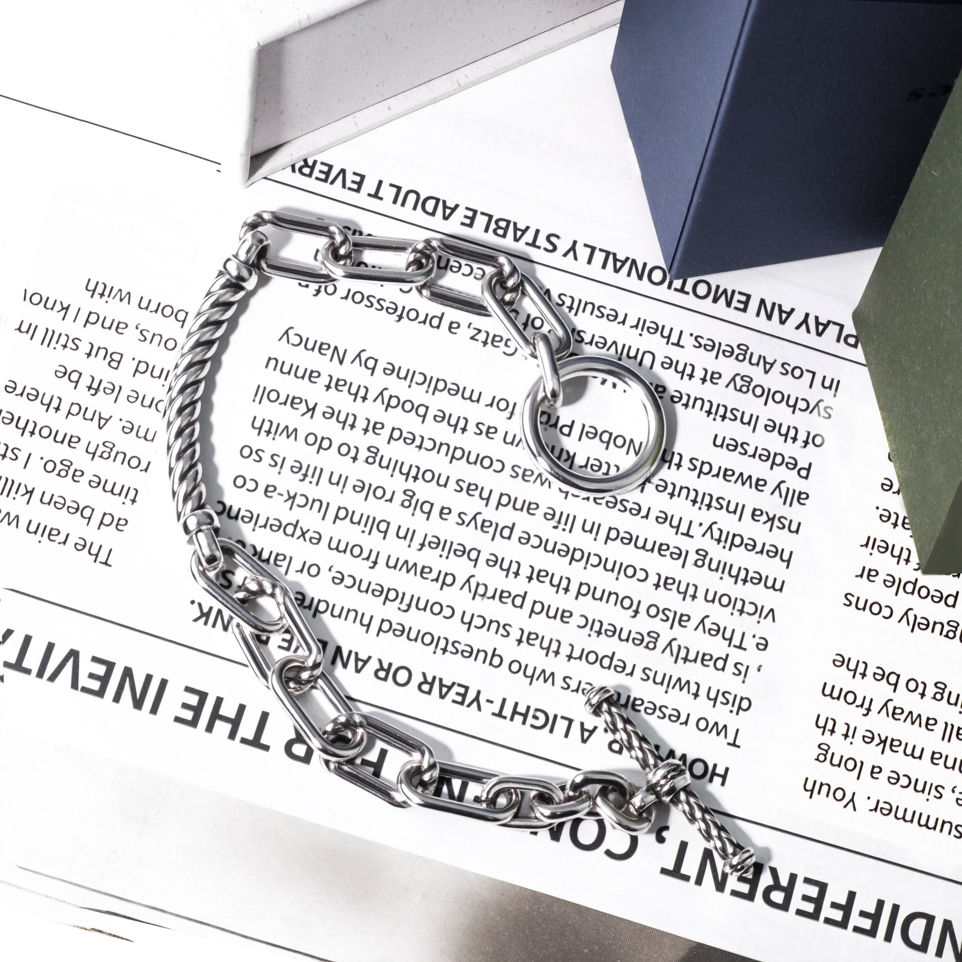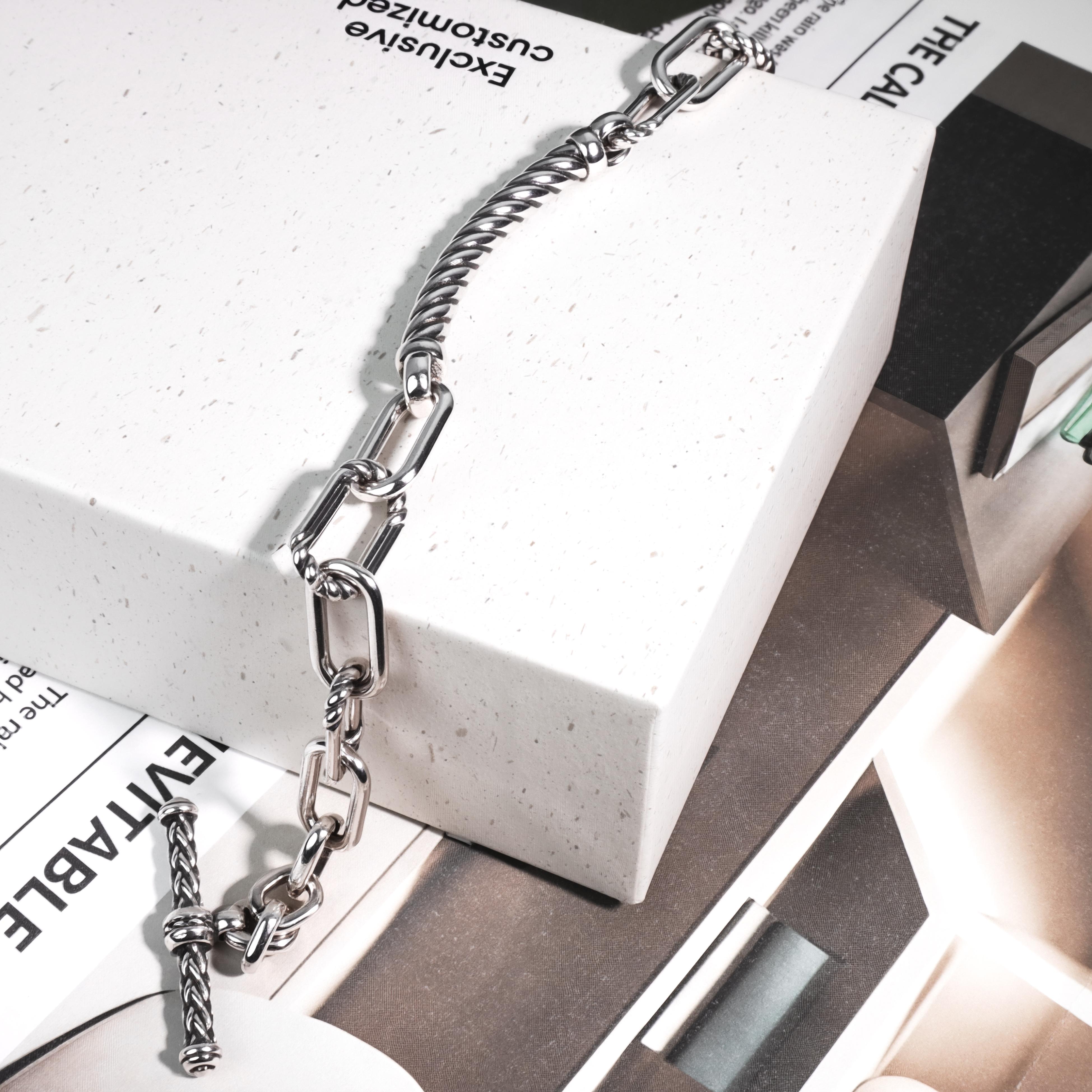 Chain splicing: The bracelet combines a variety of silver chain shapes, such as classic square buckle chain, twisted chain, etc. Different chains are connected with each other to break the monotony of a single chain, presenting the design ingenuity of “deconstruction and reorganization”, as if different styles of silver chain elements are creatively spliced together to create a unique visual hierarchy.